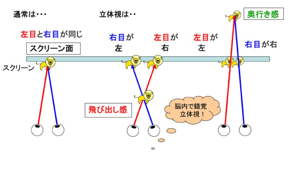 立体映像の仕組みは右の眼で見た映像と左の眼で見た映像を一つのスクリーンに映し出すものです。
