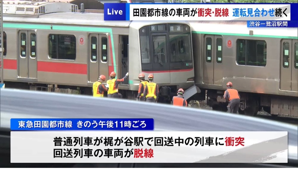 中央林間発渋谷行き普通列車(10両編成)が梶が谷駅の上り線ホームに入ろうとした際、引き込み線の途中で停止していた回送列車(同)と衝突し、回送列車の一部車両が脱線した。